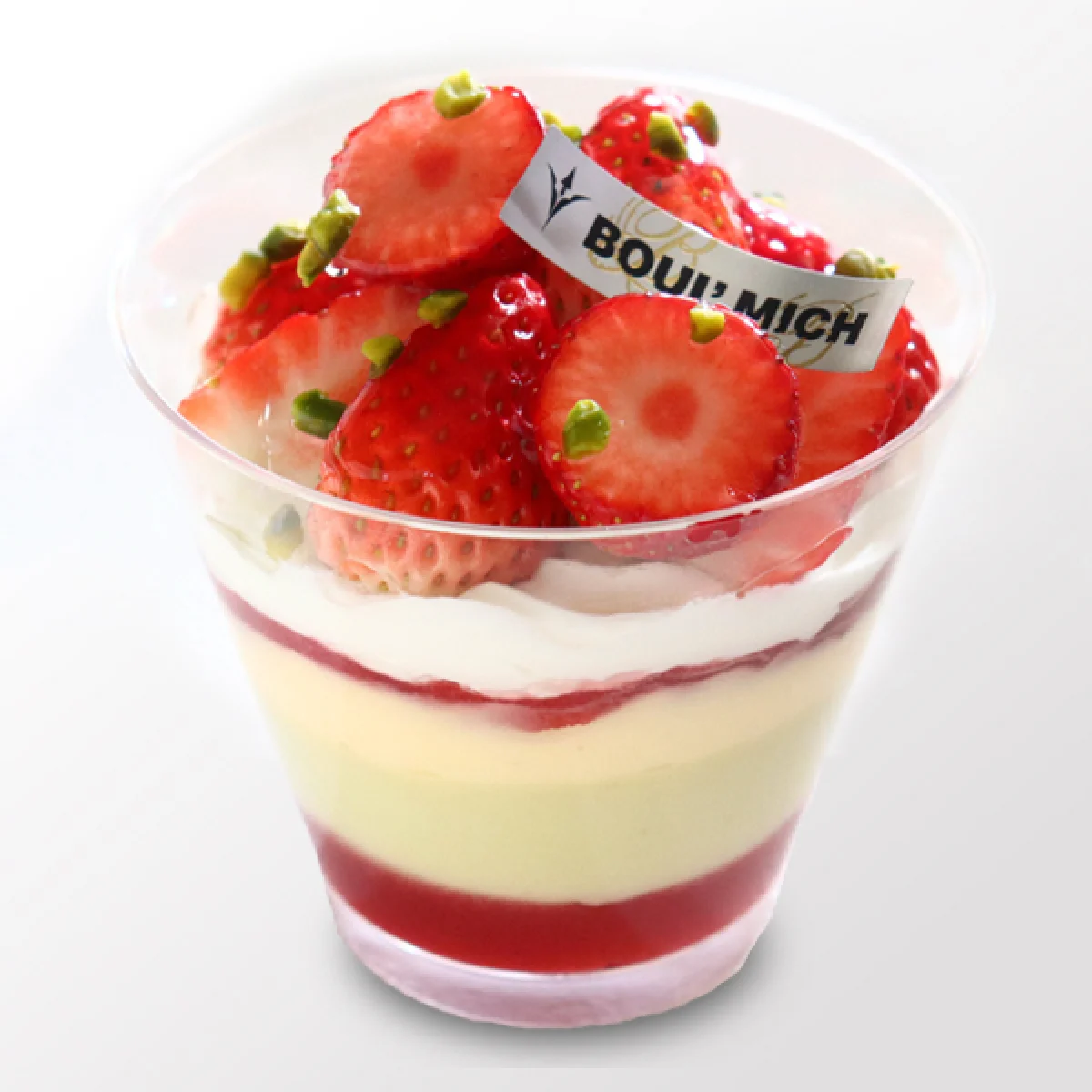 ベリーゼリーとピスタチオムース、2種類のクリームが楽しめる苺のパフェです。