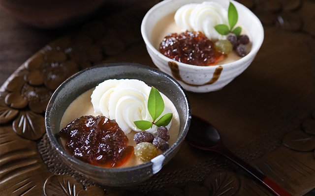 対象:どなたでも★☆☆ 【デモンストレーション中心・簡単な実習付レッスン】 ぷるぷるっとした黒蜜ジュレを添えたきなこババロア。身近な材料で作れ、ホッとする味わいが魅力です。